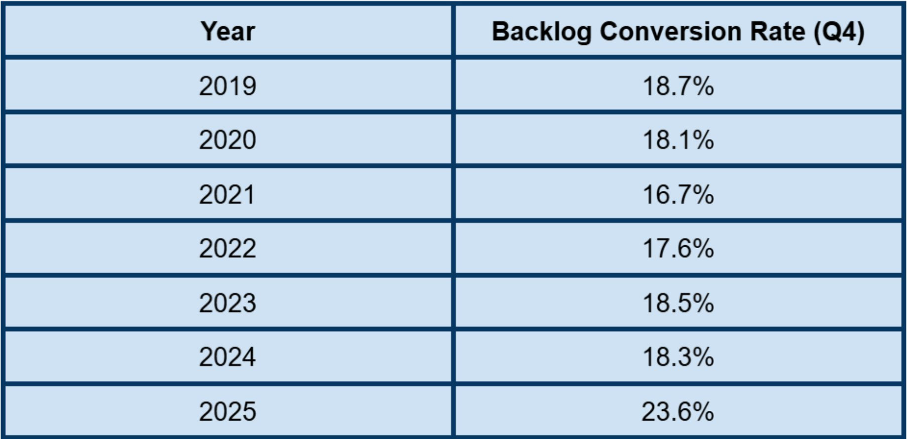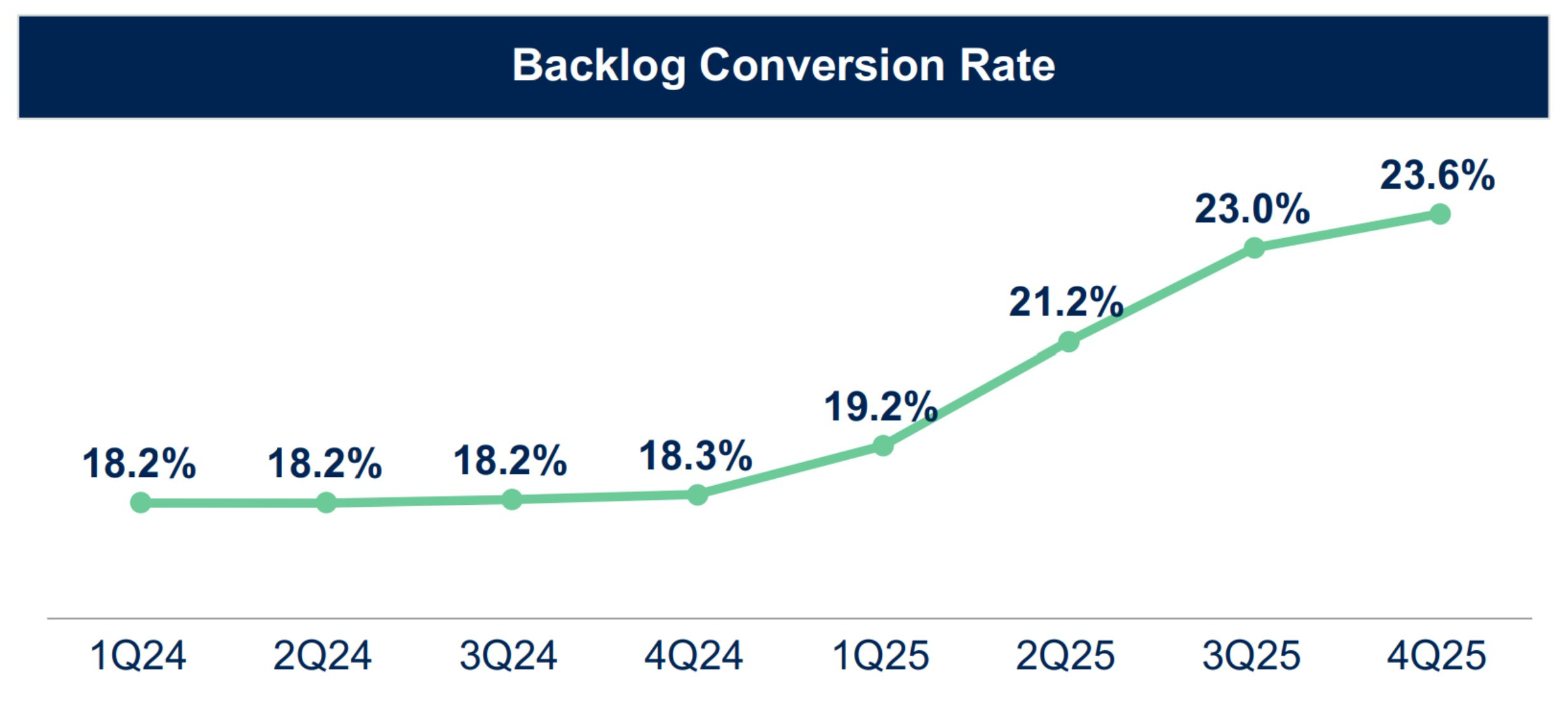 The backlog conversion rate has been on an incline heading north, displaying efficiency in realizing revenue.