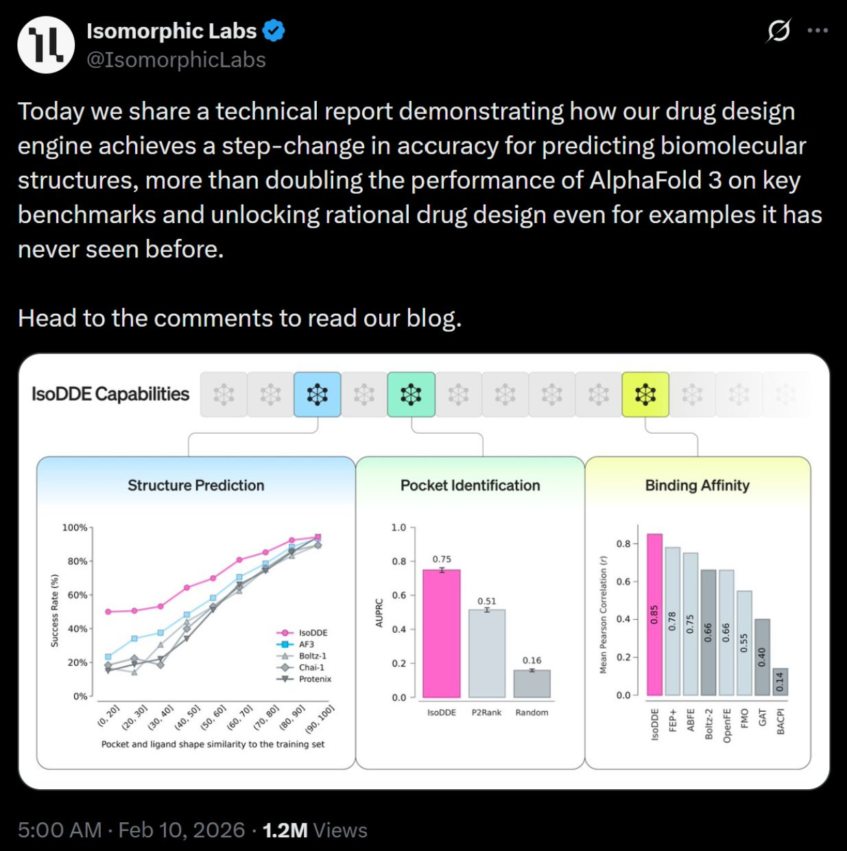 This sounds like some far off science fiction, something for us to be hopeful for achieving sometime down the line. But, actual real progress has been made; the kind that is useful in the immediate present. Just this month (February, 2026) Isomorphic released details on its drug design engine IsoDDE, which significantly outperforms AlphaFold 3 on key benchmarks and more than doubles accuracy on difficult protein-ligand structures, improves generalization to novel systems, and enables rational drug design for unseen cases.